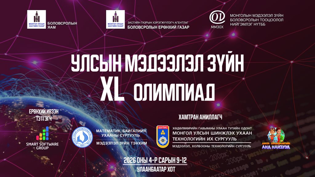 Олимпиадын товч хөтөлбөр Олимпиадын дэлгэрэнгүй хөтөлбөр үзэх Олимпиадын удирдамж үзэх Бүтээлийн уралдааны удирдамж үзэх Олимпиадад оролцогчдод өгөх мэдээлэл Олимпиадад оролцогчдын суудал хуваарилалт Эхний өдрийн дүн Багш нарын онооны самбар Дунд ангийн сурагчдын онооны самбар Ахлах ангийн сурагчдын онооны самбар Зохион байгуулагчид Ерөнхий зохион байгуулагчид Ерөнхий ивээн тэтгэгч Хамтран ажиллагч байгууллагууд