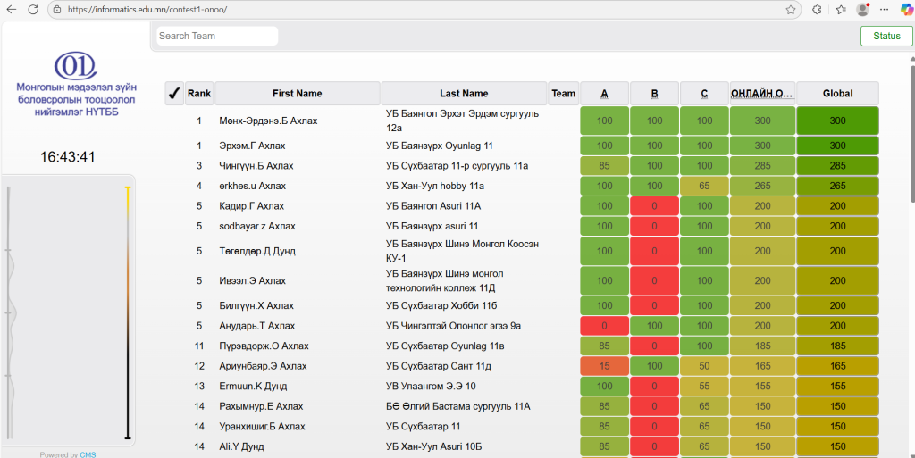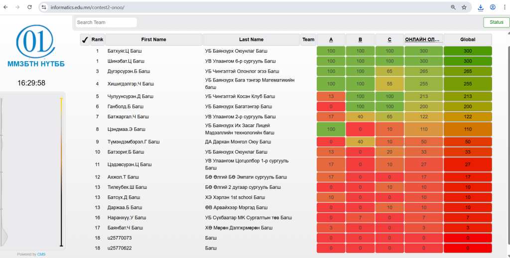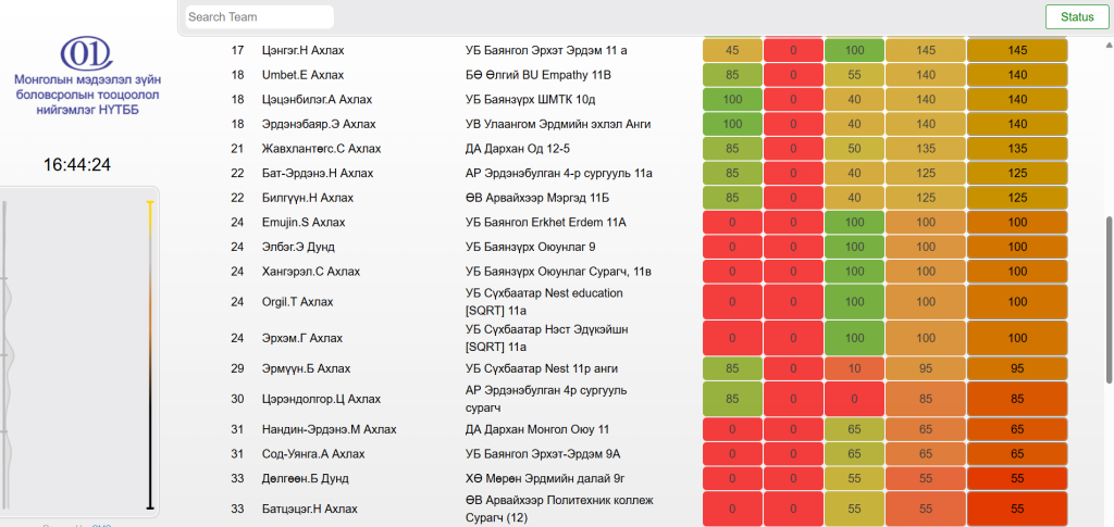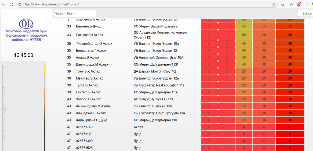 2025-2026 оны хичээлийн жилийн онлайн олимпиад-01 2025 оны 09 сарын 27 ны бямба гарагт амжилттай зохион байгуулагдаж өндөрлөлөө. Энэхүү олимпиадад 19 багш, 50 ахлах ангийн сурагч оролцож 4 цагийн хугацаанд багш 3, ахлах ангийн сурагчид 3 бодлого бодож уралдлаа.