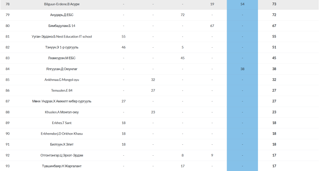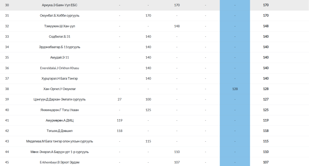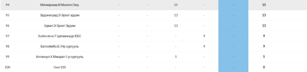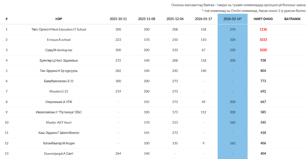 Posted inОнлайн олимпиад 2025-2026 оны хичээлийн жилийн “ОНЛАЙН ОЛИМПИАД”-ын ДУНД АНГИЛАЛ-ын нийлбэр онооны жагсаалт Posted by ulambayar 2026-02-24